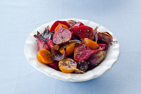 - Roast 1 hour or until beets are tender when pierced with small knife. Cool until able to handle. Peel then quarter beets. Toss beets, onions, oil, rosemary, thyme and sea salt in the same baking pan.