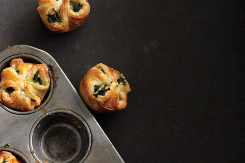 - Cut puff pastry into 3 equal strips. Reserve 1 strip for another use. Cut each remaining strip into 3 squares for a total of 6. Place a square in each muffin cup, pressing into bottom and up sides and leaving corners pointing up. Divide filling among cups. Fold pastry over filling, pressing corners together to meet in center. DO AHEAD: Spinach puffs can be assembled 3 hours ahead. Cover puffs and chill.
