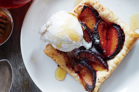 - Preheat oven to 425°. Cut pastry into six 4" squares, place on a parchment-lined baking sheet, and prick all over with a fork. Top with plums, leaving a 1/2 border.